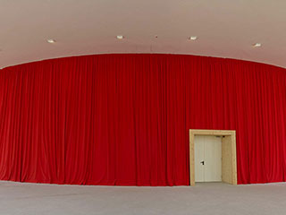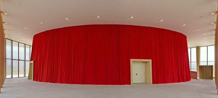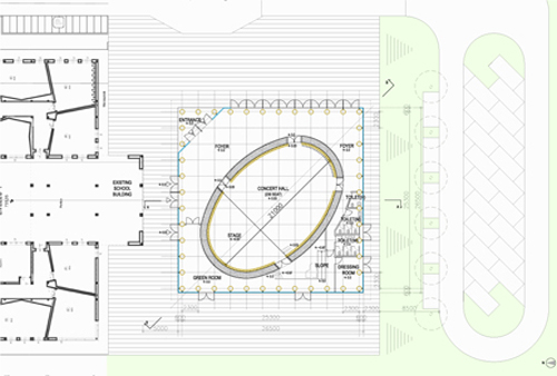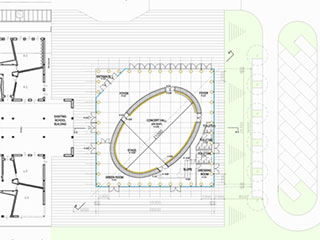 La sala si sviluppa secondo una pianta ellittica disposta diagonalmente in un quadrato con i lati di 25 metri; la struttura è in acciaio, le tamponature sono state realizzate inserendo sacchi di argilla espansa tra le maglie metalliche, successivamente, rivestite in cartone precompresso; l’involucro esterno, realizzato anch’esso con una struttura a maglia metallica, con le colonne rivestite in cartone, è in policarbonato.